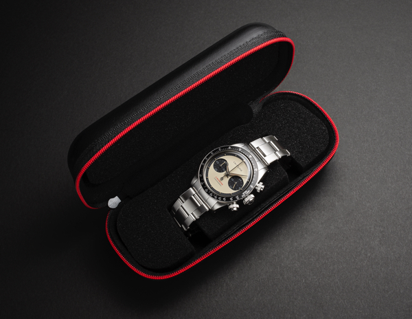 時計の箱といえば、時計を収納するだけのものが一般的で、それだと時計を取り出した後は無用の長物となることも多々あります。だとすれば収納するだけでなく、せっかくならケース単体でも常に活用できるものにすればいいじゃないかということで、持ち歩くときにも便利なメガネケースタイプの時計収納ケースを採用しました。