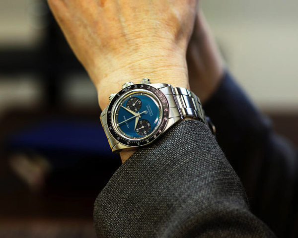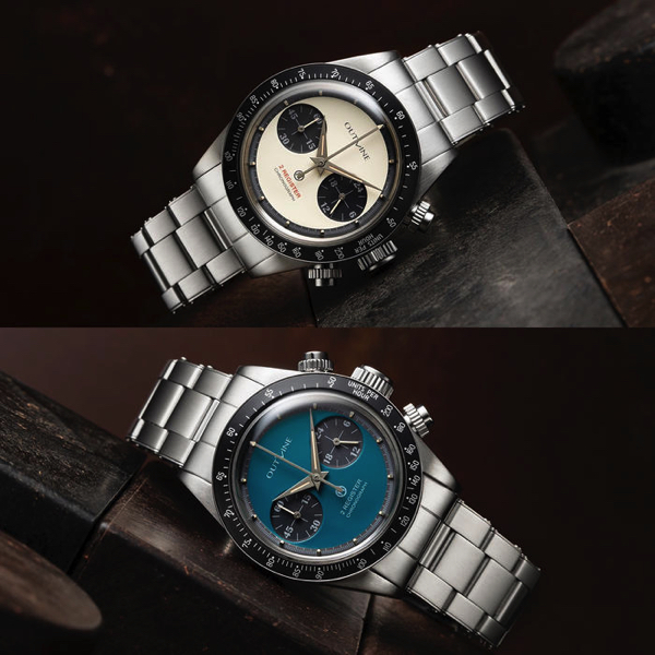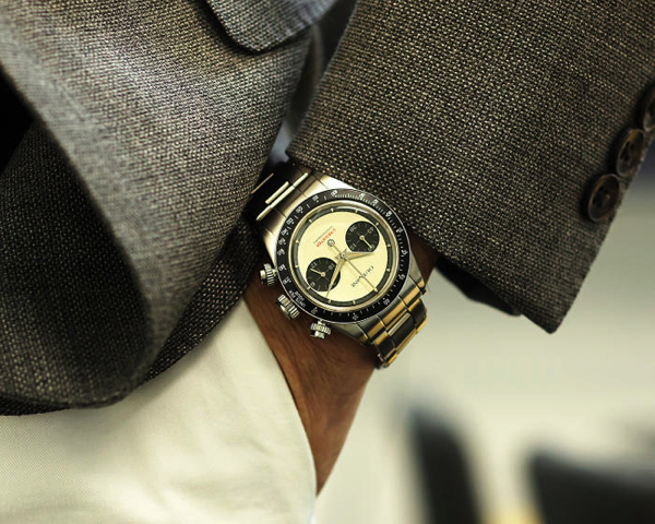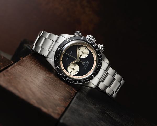 70年代の傑作クロノグラフを二つ目で再現したレトロ調メカクォーツクロノ。