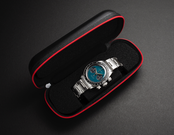 特に今回デザインのモチーフとなった往年の傑作クロノグラフは、ケース径は37.5mmと小振りで、ムーヴメント自体が手巻きだったこともあってケースも薄く、張り出した風防ガラスを含めても全体の厚さは約13mmというものでした。