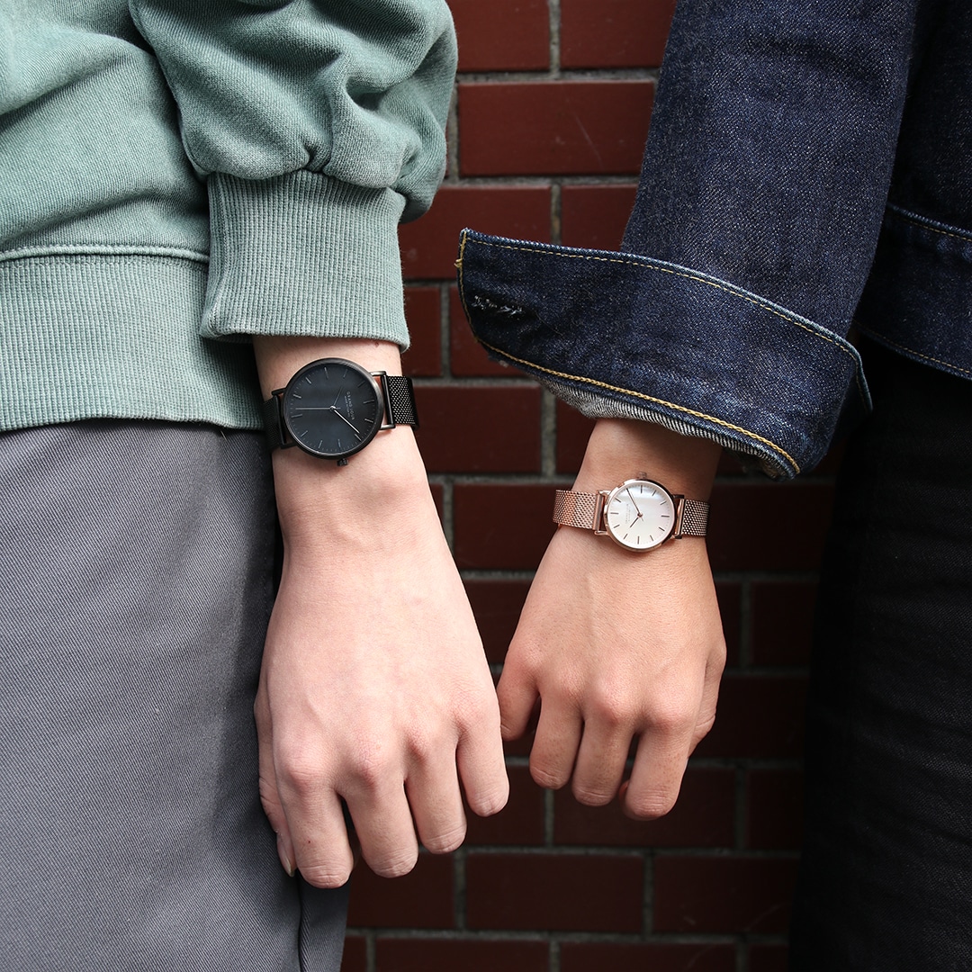 【Designed by TiCTAC】メンズ、レディースともに人気No.1のブラックとピンクゴールドのメッシュベルトタイプをぺアセットに。メッシュベルトは丈夫で、毎日着用される方にもおすすめ。