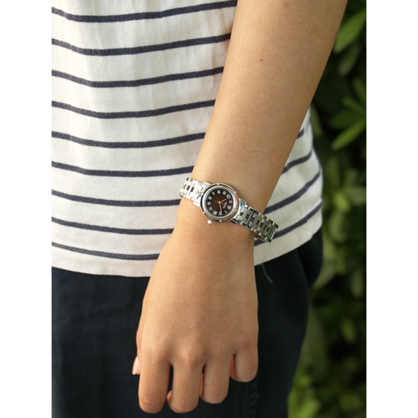 シルバーにブラックのダイヤルの腕時計はシックで落ち着いた印象。ベーシックなデザインで、ファッション問わず着用いただきやすい1本です。