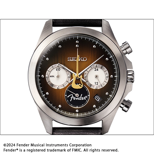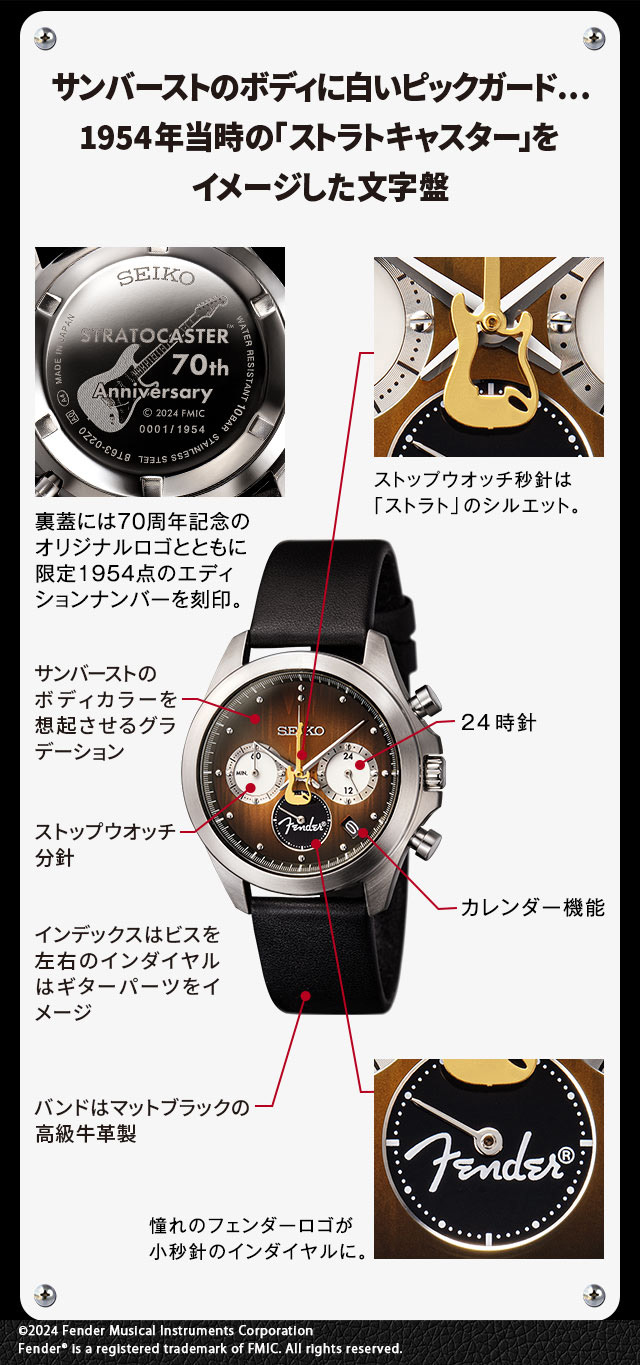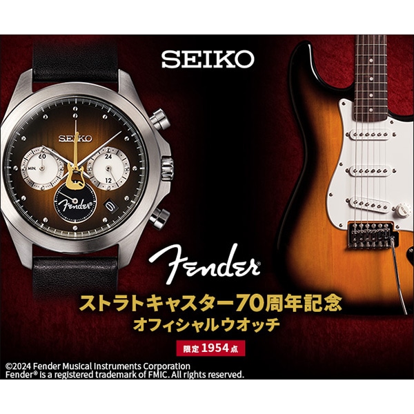憧れのストラトキャスターに捧げる、永遠のリスペクト。時を超えてよみがえる、あの高揚感 ― ミュージックシーンを一変させたエレキギターの歴史的傑作、フェンダー「ストラトキャスター」。1954年の誕生から今日まで数多のアーティストたちを触発し続けている、その多彩で刺激的なサウンドクリエーションを称え、セイコー製のスペシャルアニバーサリーウオッチが登場。1954年当時のストラトキャスターに敬意を表した「サンバースト」カラーの文字盤に、憧れのブランドロゴをあしらったインダイヤル。ダブルカッタウェイのボディを模したストップウオッチ秒針が時のリズムを刻むたび、熱い想いをかきたてます。裏蓋にはストラトキャスター70周年オリジナルロゴと、限定1954点のエディションナンバーを刻印。フェンダー純正のギターケースをイメージした特製ボックスに収めてお届けします。