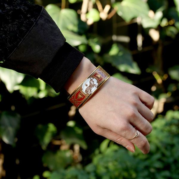 【※こちらの商品は一点ものの中古商品です】 存在感のある太めのGMサイズ。 エルメス独自のエナメルプリントで白馬など象徴的なモチーフが施されています。