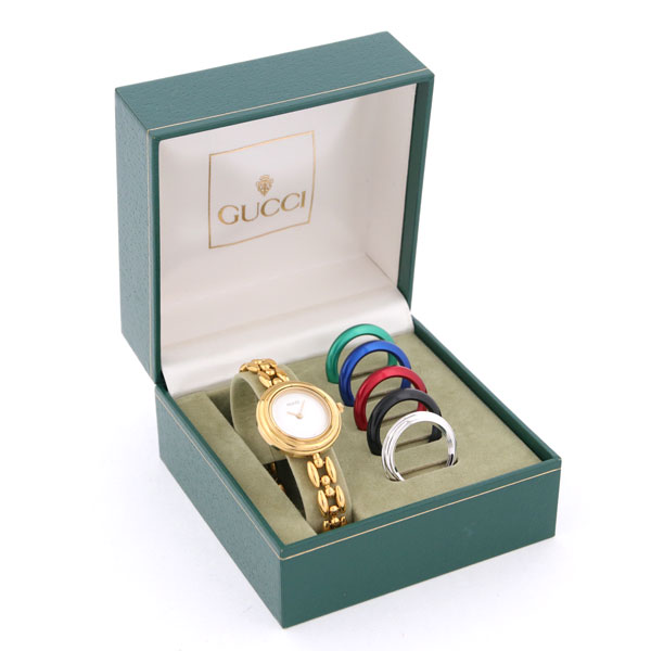 【※こちらの商品は一点ものの中古商品です】オールドグッチのチェンジベゼル。複数のベゼルが付属し、シーンやファッションに合わせてベゼルを簡単に付け替えできる人気モデル。 ボックスやベゼルの状態がよいものは希少になってきました。検討されている方はぜひお早めに。