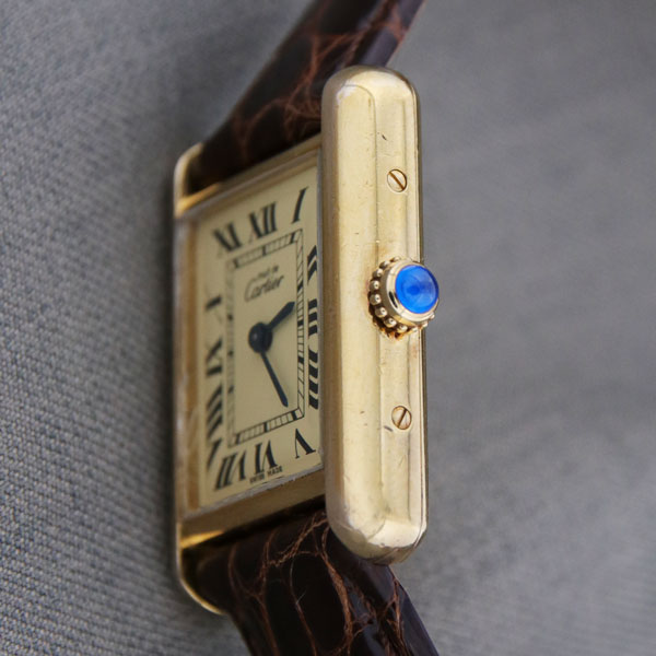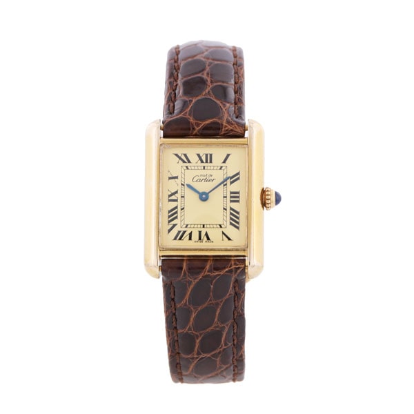 【※こちらの商品は一点ものの中古商品です】カルティエの「マストタンク」。創業者のルイ・カルティエが第一次大戦時に戦車(タンク)の轍(わだち)から着想を得たモデルで、 レクタンギュラーケースが特徴。尾錠はカルティエ純正品を取り付けております。 カルティエのマストシリーズには、地金のシルバー(SV925)ケースに20ミクロンの金貼りを施す「ヴェルメイユ技法」 という加工技術が施されており、金メッキよりはるかに手間とコストがかかる高級感漂う逸品です。
