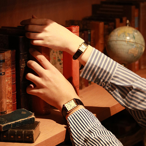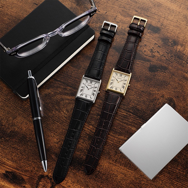 きりっとしたレクタングルケースと、ローマンインデックスでクラシカルな雰囲気が魅力。飽きることなく、ながく愛用いただきやすいデザインで、ペアウォッチにおすすめです。