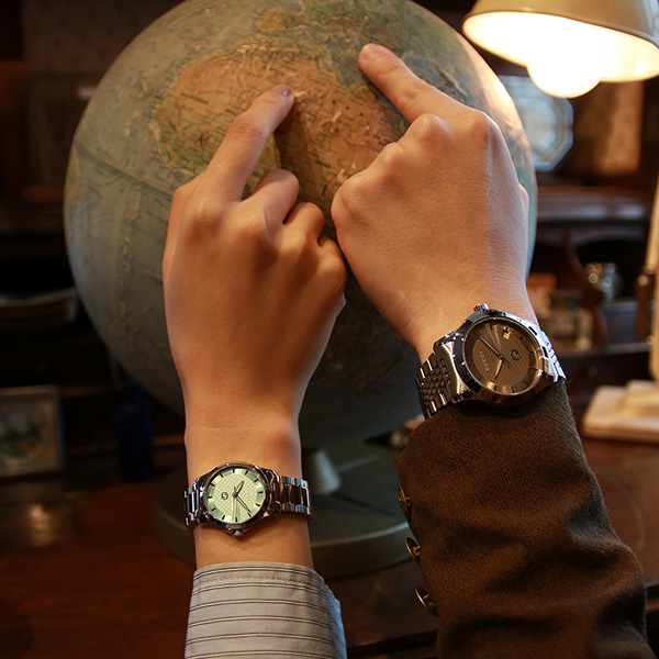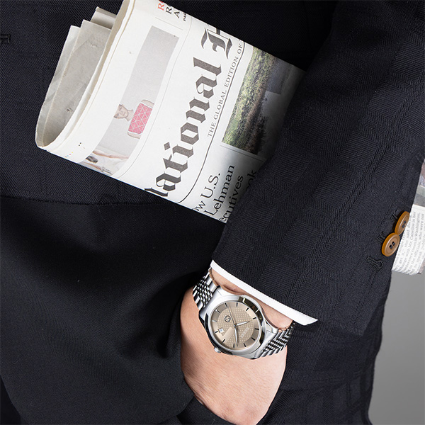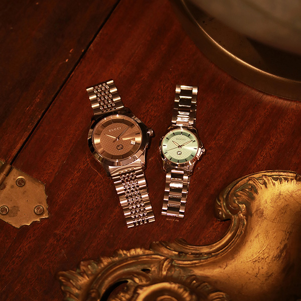 憧れのグッチ。ダイヤルカラーはあえてグレージュとライトブルーでお色違いに。とっておきの記念日や、節目のお祝いなどにおすすめです。