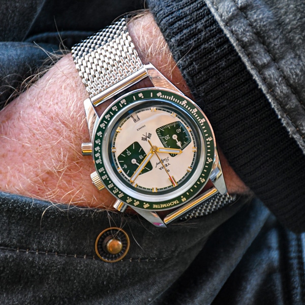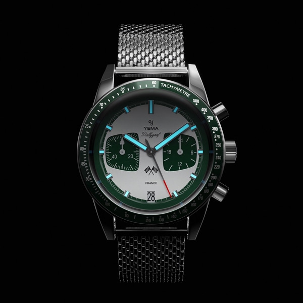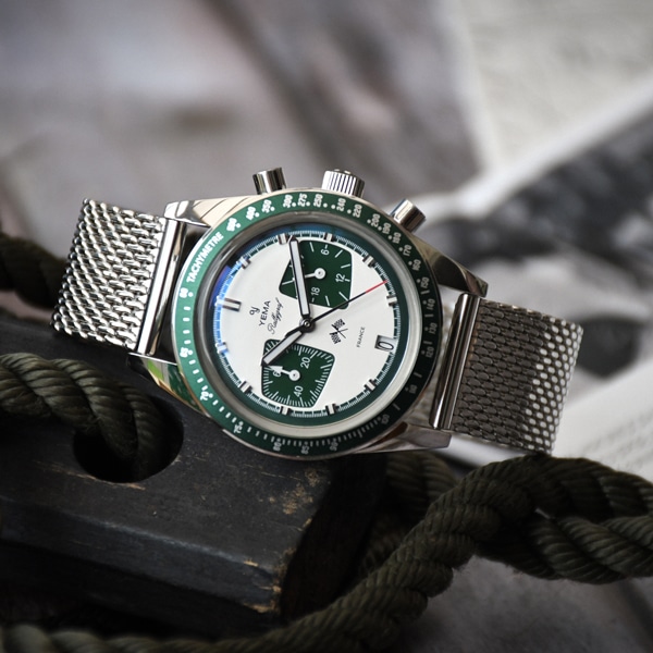【Rallygrag MECA-Quartz】伝統的なヴィンテージの外観を備えたこの時計は、文字盤の周りにタキメーター スケールを配してレースへの賛辞を表しています。新しいラリーグラフ クロノグラフは、手頃な価格のパッケージに60年代への上品なオマージュを閉じ込めたメカクォーツ ムーブメントを搭載しています。ケースバックには、油圧プレスでエレガントにエンボス加工された、イエマの歴史的なクレストが際立ちます。
