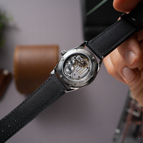 フランス職人の手によって製造されたアーバン・レザーストラップは網目模様に型押しされた革にステッチの入ったテクスチャード加工がされているため、非常に頑丈で丈夫な作り。長い年月にわたる使用にも耐え得る素材。