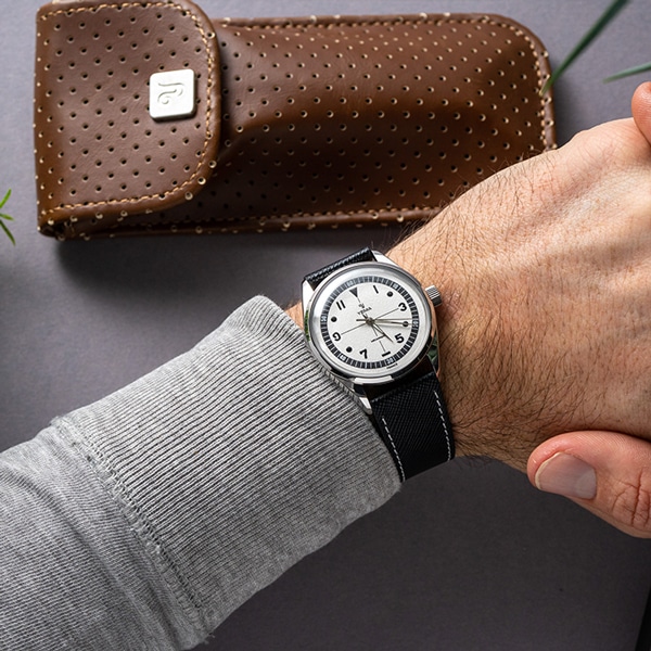 ミリタリー スタイルのフィールド ウォッチの非常に読みやすい文字盤にインスパイアされた、アーバン フィールドのミニマリストで日付のない文字盤は、ポリッシュ仕上げの上品なドーフィン針とは対照的に、頑丈なサンドブラスト仕上げが特徴。ツール ウォッチのデザイン言語に沿って、針と文字盤外周の分マーカーの両方にスーパールミノバ BGW9 グレード A が施され、暗闇での視認性も向上。