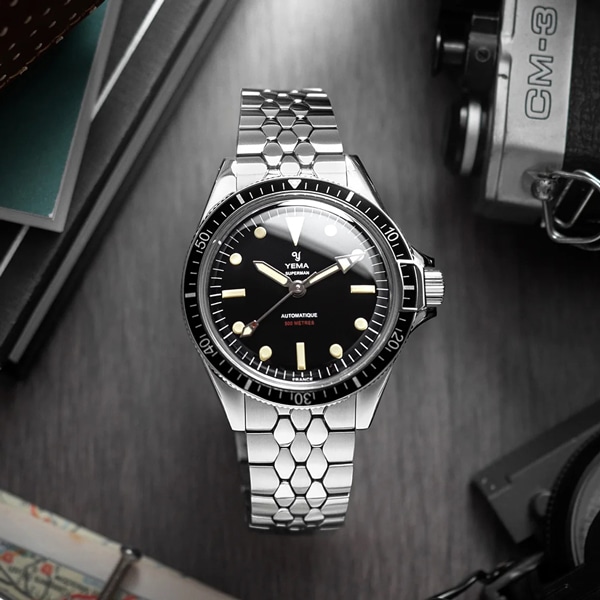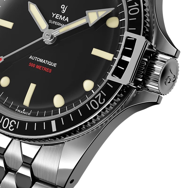 自社製キャリバー YEMA2000を搭載したスーパーマン500は、その象徴的なデザインを維持しながら、技術的な改良と近代化された構造の恩恵を受けています。ベゼルの12時位置にある発光マーカーと矢印型の発光分針は深海における劣悪な視認環境においてもダイバーに正確な潜水時間を提供いたします。
