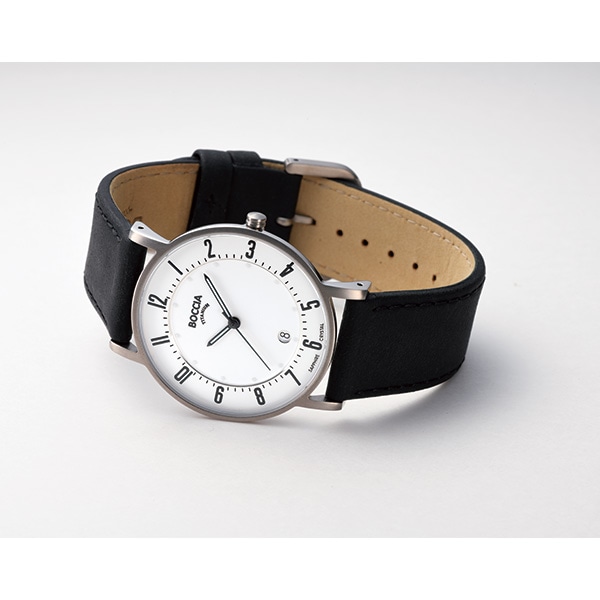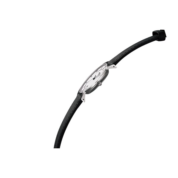 2層になったダイアルデザインが目を引くデザインのレディースウォッチ。風防には、サファイアクリスタルを使用しているため、視認性に優れ、傷がつきにくく安心してお使いいたけます。チタンケースの厚みは7mm以下に抑えてあり、レザーストラップ(バックルもチタン製)が手首にフィットする使い心地も抜群の時計です。デイトカレンダー付き。