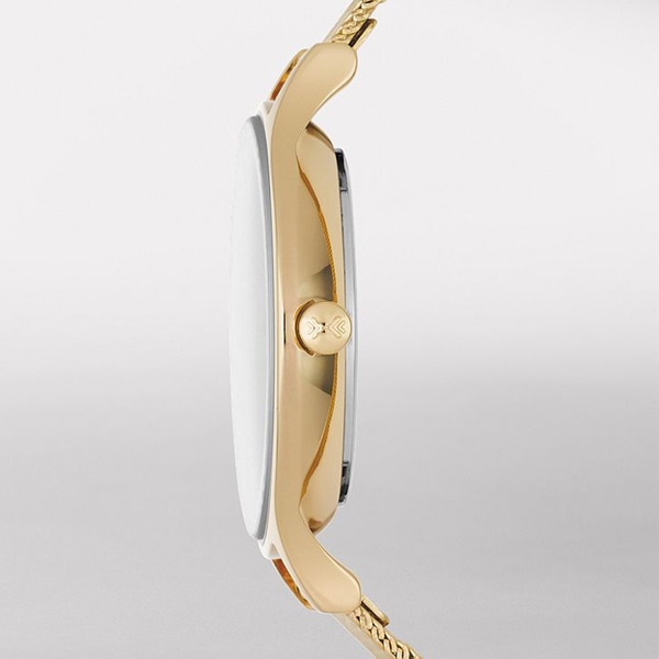 シンプルなラウンドケースに沿って流れるようにシェイプされたラインが美しいモデル。肌馴染みの良いメッシュストラップを採用し、インデックスのラインストーンもスタイリッシュさを演出。