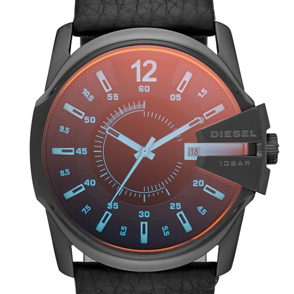 大胆なマルチカラーのダイヤルとブラックのラグドレザーストラップを組み合わせた、DieselのMASTER CHIEFウォッチ。エッジの効いた風格が特徴です。