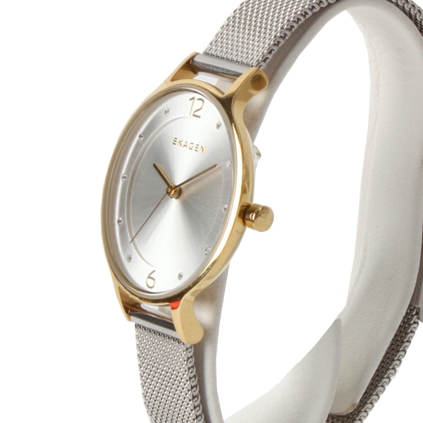 デンマーク語で「優美さ」を表すANITAコレクション。上品な輝きを持つゴールドのケースと、シルバーのダイヤル、インデックスにあしらわれたクリスタルが、エレガントな雰囲気。