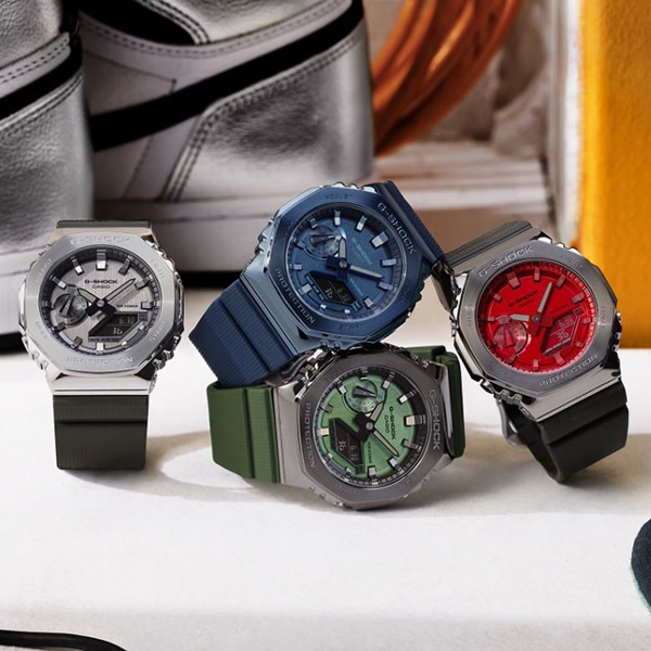 G-SHOCKの初代モデル“DW-5000C”にも採用された“八角形フォルム”を継承するGA-2100シリーズから、メタル素材を採用したモデルが加わります。ステンレスのベゼルに、円周状のヘアライン仕上げを施し、ダークグレーIPでコーティングすることで、シックなデザインにしています。文字板に蒸着処理を施し、GA-2100らしいシンプルデザインをシャープかつスタイリッシュに引き上げました。バンドには徐々に変化するチェッカーパターンのテクスチャをさりげなく入れ、カジュアルな印象の樹脂バンドに上質感をプラスしています。初代から受け継がれるコンセプトはそのままに、時計としてのクオリティを追求し外装や装着性の進化に磨きをかけたモデルです。