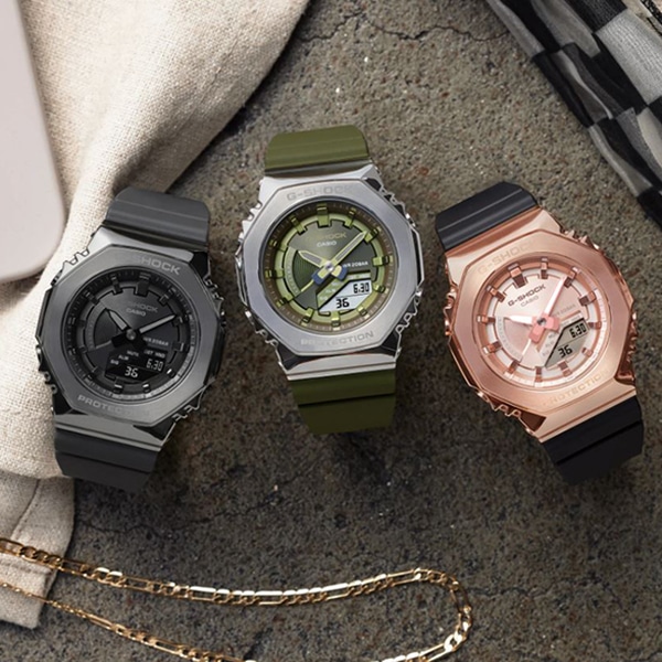 G-SHOCKの初代モデル“DW-5000C”にも採用された“八角形フォルム”を継承するGA-2100シリーズから、メタル素材を採用したモデルが加わります。GA-2100シリーズの中でも、どんなシーンにもフィットするよう小型化、薄型化に徹底的にこだわったGMAS2100をベースにベゼルカバー部分に硬質なステンレス素材を採用し質感を向上。文字板に沿って円周上に入れたヘアライン加工により、ベゼルのIP加工の濃淡を表現。フラットな文字板にも蒸着処理を施し、スタイリッシュな印象に。更にインデックスにはミラー加工を施し華やかさをプラス。初代から受け継がれるコンセプトはそのままに、時計としてのクオリティを追求し外装や装着性の進化に磨きをかけたモデルです。