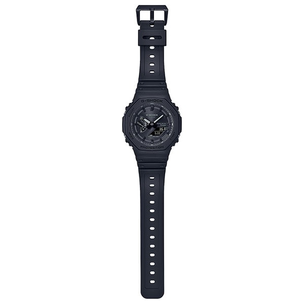 初代G-SHOCKのデザインコンセプトを受け継いだGA-2100の八角形フォルムはそのままに、スマートフォンリンクとタフソーラーを搭載しました。高機能化に伴う部品点数の増加に対応するため、基板配置を最適化した薄型モジュールを新しく開発。カーボンコアガード構造と組み合わせることで、従来モデルのサイズ感をキープしています。全体をミニマルなカラーリングで仕上げたオールブラックのモデルです。