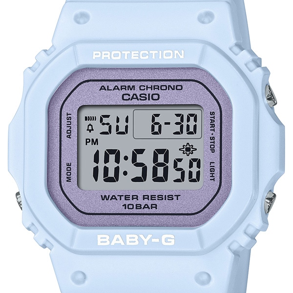 アクティブな女性に向けた耐衝撃・カジュアルウオッチBABY-Gから、春の季節にぴったりのフラワーカラーに彩られたモデルです。ベースモデルには、コンパクトなサイズが人気のBGD-565をセレクト。カラーは3色。それぞれ、「ライラック」「セージ」「桜」をイメージしてご用意しました。ライラックとセージをモチーフにした2モデルは、フェイスまで同系色のワントーンスタイルにしました。桜をイメージしたバイカラーモデルは、ホワイトとペールピンクで普段使いしやすい落ち着いた印象に。ダイアルには光沢感のあるパール塗装を施し、華やかさをプラスしました。春気分をより一層盛り上げてくれるウオッチです。