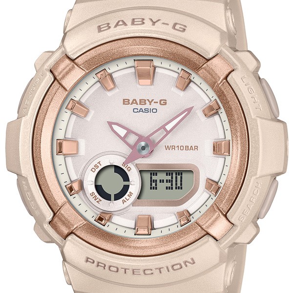 アクティブな女性に向けた耐衝撃・カジュアルウオッチBABY-Gから、ベーシックスタイルと相性の良いカラーのモデルの登場です。ベースモデルは丸みのあるシルエットとパーツを重ねた多層構造ケースが特徴のBGA-280を採用。カラーは幅広いファッションに取り入れやすいくすみ系のネイビーとピンクベージュの2色をラインアップしています。ピンクベージュのモデルはパール塗装を施し、光沢感のある印象に。ベゼルリングのメタリック仕上げとダイアルのインデックスの蒸着仕上げで、華やかさをプラスしています。機能面では、耐衝撃構造や10気圧防水機能など日常生活で頼れる機能を備えています。ベーシックカジュアルで実用性の高いウオッチです。