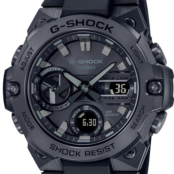 1983年の発売以来、飽くなき強さを求めて進化を続けるタフネスウオッチG-SHOCK。メタルと樹脂の異素材を融合したG-STEELをベースに人気のオールブラック仕様のモデルです。ブラックをベースにブラックIPを施したメタルベゼルを採用し、シックでファッションアイテムとして幅広く活用できるデザインに仕上げました。ベースモデルには、薄型モジュールとカーボンコアガード構造のGST-B400を採用しています。タフネスとデザイン性を両立した、G-STEELシリーズにオールブラックのカラーリングで、幅広くご利用いただけるクールなデザインとなっております。