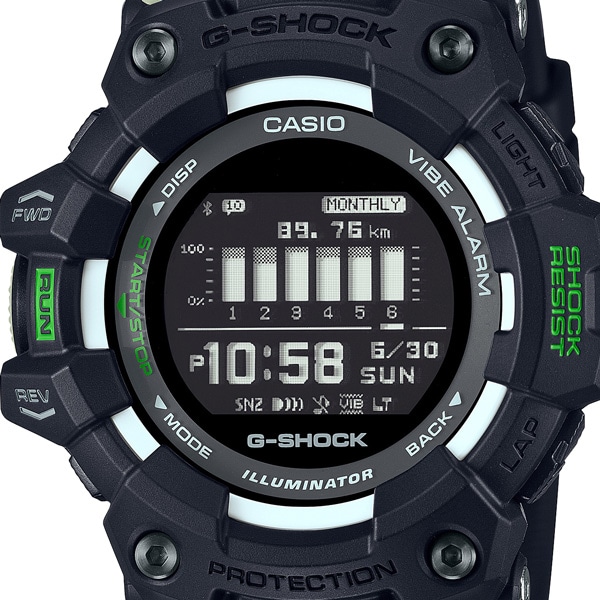 【備考】耐衝撃構造 / トレーニング機能:加速度センサーによる距離、速度、ペースなどを計算して表示、自動/手動ラップ機能、オートポーズ機能、到達お知らせアラート設定機能(時間、消費カロリー)ON/OFF切替機能、トレーニング表示カスタマイズ機能(計測タイム、距離、ペース、ラップタイム、ラップ距離、ラップペース、平均ペース、速度、平均速度、消費カロリー) / トレーニングログデータ(最大100走分、ラップデータはそれぞれ最大140本):計測タイム、距離、ペース、消費カロリー / ライフログデータ:<デイリーデータ表示>歩数、<月間データ表示>走行距離 / ユーザープロフィール設定機能 / モバイルリンク機能(AutomaticConnection、対応携帯電話とのBluetooth通信による機能連動)/ バイブレーション機能 / ワールドタイム:世界38都市(38タイムゾーン、サマータイム自動設定機能付き)+UTC(協定世界時)の時刻表示 ※スマートフォンとの連携により更新される場合があります。 / ストップウオッチ(1秒、100時間計、スプリット付き) / タイマー:最大5つの時間設定が可能なインターバル計測用のタイマー(セット単位:1秒、最大セット:60分、1秒単位で計測、オートリピート、オートスタート ) / 時刻アラーム4本(スヌーズ機能付き)/ パワーセービング機能(毎日一定時間になると表示を消して節電します) / フルオートカレンダー / 12/24時間制表示切替 / 機内モード / 操作音ON/OFF切替機能 / 操作バイブレーションON/OFF切替機能 / LEDバックライト(オートライト、スーパーイルミネーター、残照機能、残照時間切替(1.5秒/3秒)付き)