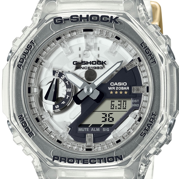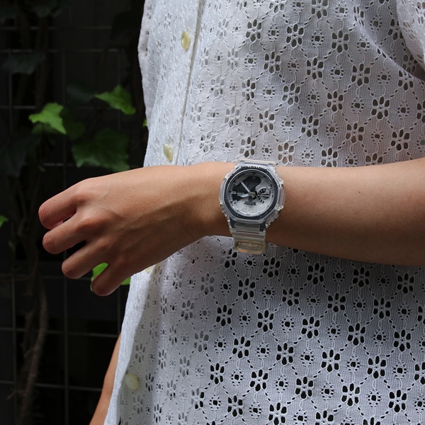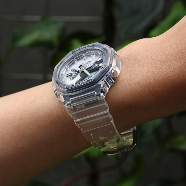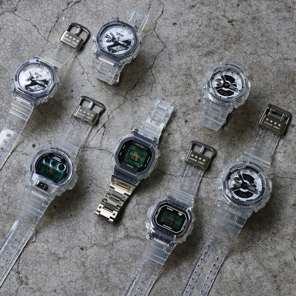 1983年の誕生以来タフネスを追求し、2023年に40周年を迎えるG-SHOCKの限定モデル「G-SHOCK 40thAnniversary Clear Remix(クリアリミックス)」シリーズです。G-SHOCKの人気モデルの再構築をイメージし、クリアパーツを使用することで、これまでにない透明感を表現しました。ベースデザインには、定番デジタルのDWE-5600、初代のDW-5000、フロントボタンのDW-6900、ペアでも着用できる、GA-110とGMA-S110、GA-2100とGMAS2100を採用しています。各モデルには、スケルトン素材のバンド、ケース、ダイアル、LCD、ボタンを採用し、デジタルモデルの回路基板には、Gマークなどを基板パターンにし、40周年を記念する特別な仕様になっています。更にDWE-5640RXは樹脂とメタルの異素材を融合したバンドデザインで、G-SHOCKの素材進化をシンボリックに表現しています。スケルトンケースには、初採用となる透明グラスファイバーダイアミドを使用しています。また、ケースバックにはG-SHOCK25th、30th、35thのロゴもデザインを手がけたエリック・ヘイズの手による40thロゴを、遊環や中留などには“40”を表現するスターマークを刻印するなど、限定モデルに相応しい仕様になっています。※・スケルトンケース(DW-6940RX、GA-114RX、GMA-S114RX)・スケルトンダイアル(DW-6940RX、GA-114RX、GA-2140RX、GMA-S114RX、GMA-S2140RX)・スケルトンLCD(DWE-5640RX、DW-5040RX、DW-6940RX)・スケルトンボタン(GA-114RX、GMA-S114RX)
