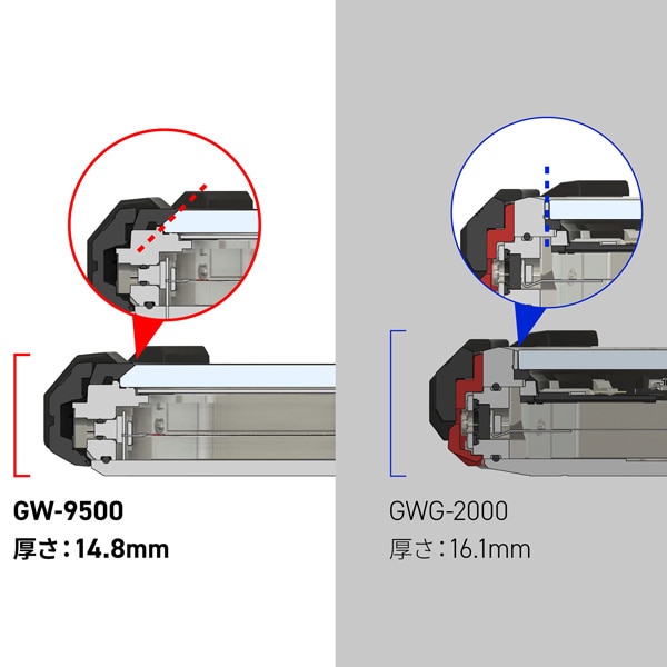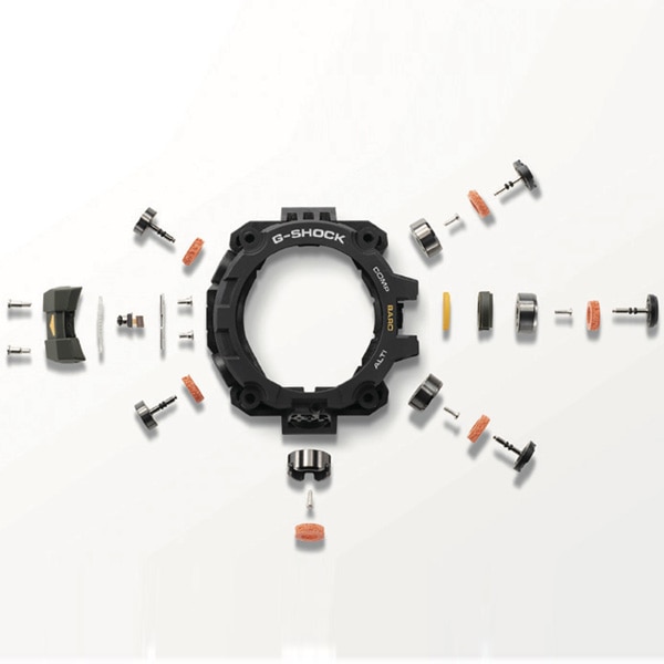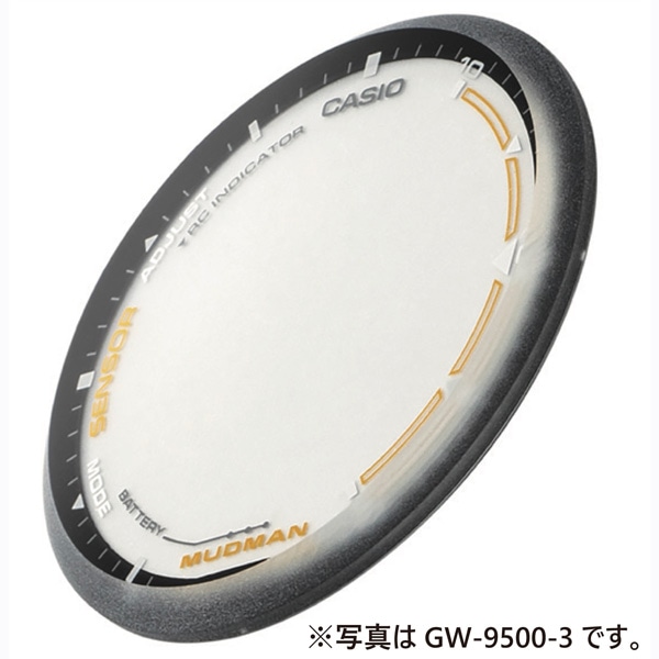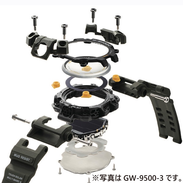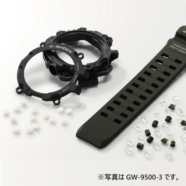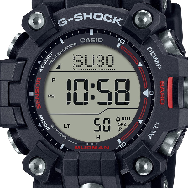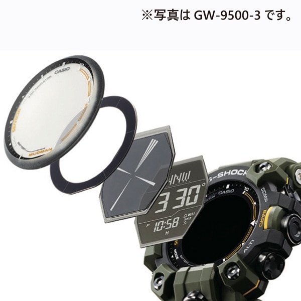 過酷な自然環境に立ち向かう男たちをサポートするG-SHOCK MASTER OF Gシリーズから、マッドレジスト構造を搭載したMUDMANのトリプルセンサーモデルです。フロントボタンと三つのダイレクトセンサーボタンには、大型で操作がしやすく、泥水を排出しやすい形状を採用し、シリンダー型のステンレスパーツで保護。ボタンシャフトにガスケットを備え、泥、塵の侵入を防ぎます。高度・方位・気圧/温度のトリプルセンサーと、二層液晶を採用しながら薄型化の両立を図りました。薄型モジュールの採用や、カーボンコアガード構造、端面にカッティングを施した風防ガラスの採用などで薄型・小型化と高い装着性を実現しています。多機能、多パーツで構成された外装により、薄型でも力強いデザインに仕上がりました。更に、二層液晶によりデジタルコンパスの実用性を向上。上部の液晶で方位をグラフィック表示し、下部の液晶で時刻や計測値を大きく表示します。また反転表示の二層液晶を開発し、GW-9500-1A4JFと3JFに初採用しています。光を動力に正確な時を刻む電波ソーラー、暗所での視認性を確保するスーパーイルミネーターなどの実用的な機能も搭載しています。ケース、ベゼル、ウレタンバンドには再生可能な有 機資源であるバイオマスプラスチックを採用。裏蓋には、MUDMANのシンボルであるモグラのキャラクターがコンパスを持った姿を刻印しました。