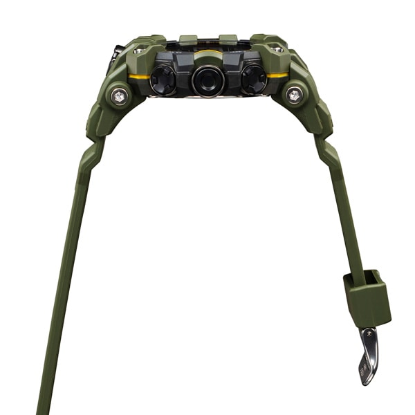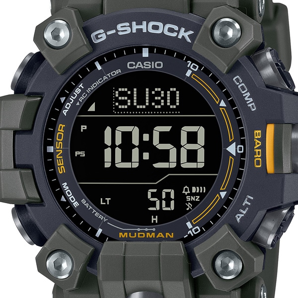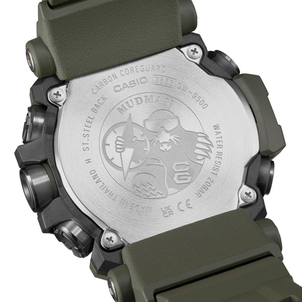 過酷な自然環境に立ち向かう男たちをサポートするG-SHOCK MASTER OF Gシリーズから、マッドレジスト構造を搭載したMUDMANのトリプルセンサーモデルです。フロントボタンと三つのダイレクトセンサーボタンには、大型で操作がしやすく、泥水を排出しやすい形状を採用し、シリンダー型のステンレスパーツで保護。ボタンシャフトにガスケットを備え、泥、塵の侵入を防ぎます。高度・方位・気圧/温度のトリプルセンサーと、二層液晶を採用しながら薄型化の両立を図りました。薄型モジュールの採用や、カーボンコアガード構造、端面にカッティングを施した風防ガラスの採用などで薄型・小型化と高い装着性を実現しています。多機能、多パーツで構成された外装により、薄型でも力強いデザインに仕上がりました。更に、二層液晶によりデジタルコンパスの実用性を向上。上部の液晶で方位をグラフィック表示し、下部の液晶で時刻や計測値を大きく表示します。また反転表示の二層液晶を開発し、GW-9500-1A4JFと3JFに初採用しています。光を動力に正確な時を刻む電波ソーラー、暗所での視認性を確保するスーパーイルミネーターなどの実用的な機能も搭載しています。ケース、ベゼル、ウレタンバンドには再生可能な有 機資源であるバイオマスプラスチックを採用。裏蓋には、MUDMANのシンボルであるモグラのキャラクターがコンパスを持った姿を刻印しました。