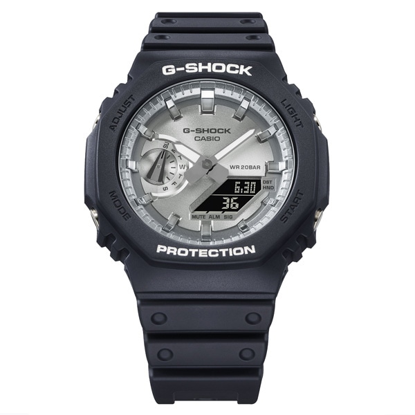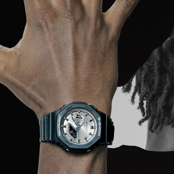 1983年の発売以来、飽くなき強さを求めて進化を続けるタフネスウオッチG-SHOCK。八角形デザインが特徴的なGA-2100シリーズのカラーモデルです。モデル全体を光沢感のあるブラックとマットな質感のブラックでそれぞれ統一し、フェイスに人気のゴールドとシルバーの蒸着文字板を採用。シックでファッションアイテムとして活用できるデザインに仕上げました。タフネスとデザイン性を両立した、幅広くご利用いただけるクールなデザインとなっています。
