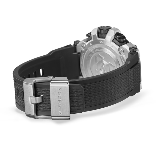ステンレス製の裏蓋を、何工程ものプレス、切削、研磨を駆使し立体的な複雑形状に成形。バンドを固定するラグや、りゅうずガード、ボタンガードの機能を裏蓋に持たせるという構造とデザインに挑戦し、小型薄型化も実現しています。また、高密度実装技術により薄型の多機能モジュールを開発することで、裏蓋からベゼルまでが12.1mmとなり、既存のMT-Gモデルと比べて大幅に薄くなりました。更に工具無しでバンドの付け替えが簡単にできるワンプッシュ式交換バンド構造により、ラグ部のボタンを両サイドから挟むように押すことで、簡単にバンドの付け替えができます。ステンレスのベゼルにブラックIPコーティングした後に、ヘアライン加工で再度仕上げを施して、天面のみステンレスを露出させています。バンドにはブラックのソフトウレタンバンドを採用し、シルバーとブラックのモノトーンボディに、フェイスのレッドが映えるデザインに仕上げました。透明度の高いサファイアガラスを採用し、ダイアルにはカシオ山形工場の微細加工技術による繊細な造形と、蒸着加工を施すことで高い質感に仕上げています。機 能 面 ではBluetooth?通信機能により専用アプリ「CASIO WATCHES」と接続し時刻情報を取得。マルチバンド6とタフソーラー、高輝度なLEDライトも搭載し、実用的な機能も備えました。