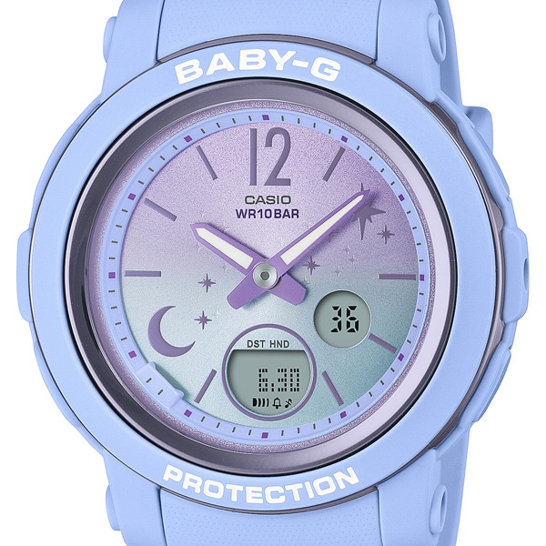 アクティブな女性のためのカジュアルウォッチBABY-Gから、夜空に輝く月と星をテーマにしたウォッチです。