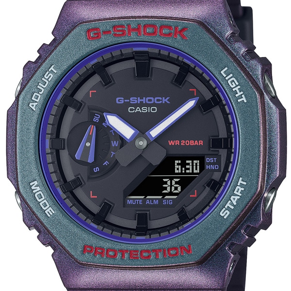 ゲームの世界と現実世界とのクロスオーバーをイメージし、常に変化する状況を角度によって見え方が異なる、パープルの偏光塗料を使って表現しました。また、ターゲットスコープをオレンジの差し色や、液晶画面のグラフィック、文字板などに落とし込み、遊び心のある仕上がりになっています。ベースモデルには、オクタゴンケースのGA-2100を採用。見る角度によって表情が変わるカラーリングを採用した、近未来的なデザインとなっています。