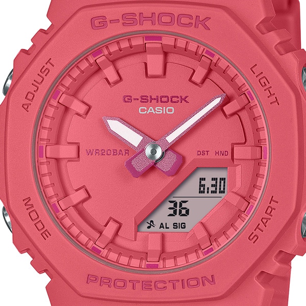 人気のデジタル・アナログコンビモデルGMA-S2100をさらに小型化したモデル。GMA-P2100シリーズは、バンドの長さも短くすることで、華奢な手もとによりフィットするように装着性を高めました。