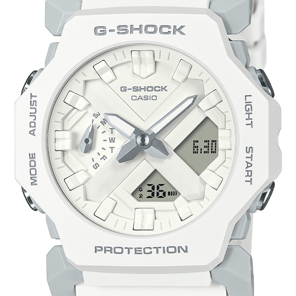 タフネスを時代のニーズに合わせて小型化、薄型化したコンビモデルGA-2300は、無駄をそぎ落としたミニマルなデザインで近未来的なイメージを目指しました。ケース径は45.4×42.1mm、厚さは11.6mmとこれまでのG-SHOCKと比較しても大幅に小さくなっています。定番のブラック、ホワイトに加えて、ビビッドなピンクを採用し、液晶部分にもピンクカラーを採用しています(4AJFのみ)。そのデザイン性からG-SHOCKの新しい可能性を秘めた新たなベーシックGA-2300です。