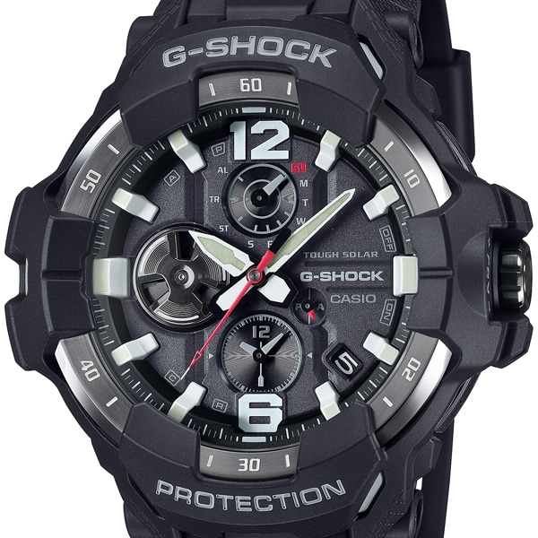 過酷な環境下で活動するプロフェッショナルに向けたG-SHOCK MASTER OF Gシリーズから、航空コンセプトのGRAVITYMASTER GR-B300です。GR-B300は、航空機の機体にも使用されるカーボン素材の特性(耐衝撃性・剛性・耐劣化性)を活かした耐衝撃構造「カーボンコアガード構造」を採用したGRAVITYMASTERです。
