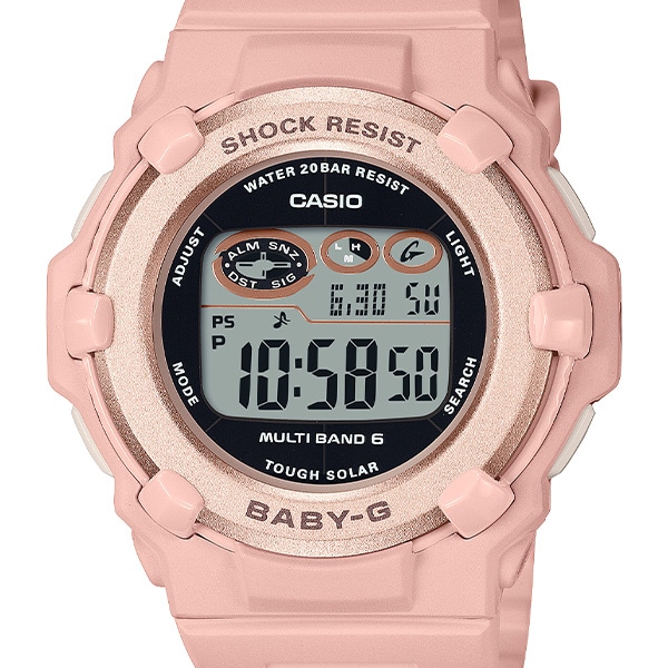 アクティブな女性のためのカジュアルウオッチBABY-G。シンプルで様々なファッションに合わせやすい薄型ラウンドフェイスのデジタルモデルです。カラーはベーシックなホワイトとピンクをラインアップ。季節を問わず幅広いファッションに合わせやすいデザインです。