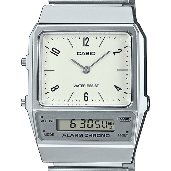 アラビアインデックスと光沢仕上げのフェイスカラーがレトロモダンな印象のモデルです。文字板と液晶が独立したデザインで、アナログの美しさとデジタルの機能性を両立。角型フォルムのケースと横長の駒形状を採用したメタルバンドを組み合わせることで、スタイリッシュな外観に。ストップウオッチ、アラーム、デュアルタイム等、日常生活に便利な機能も備えています。