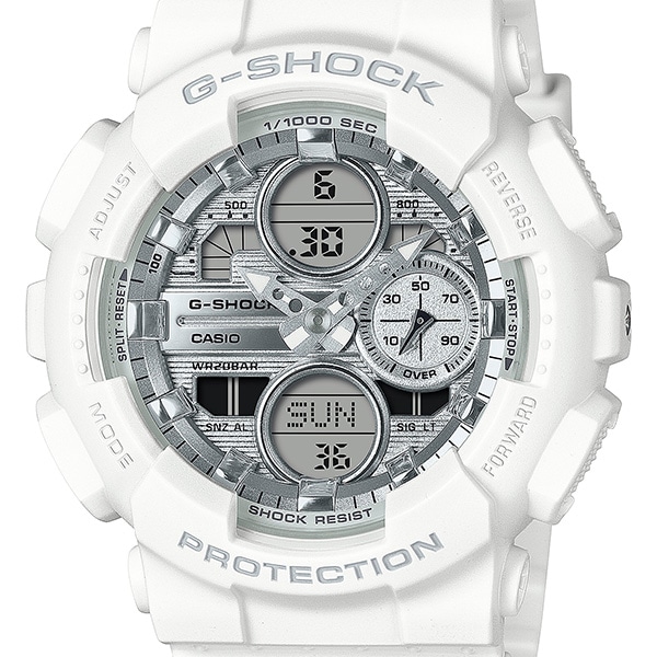 ベースモデルは人気のデジタル・アナログコンビモデルを小 型 化したGMA-S120、GMA-S140、GMA-P2100の3モデル。白のワントーンでまとめながらも、文字板やインデックスパーツにシルバーの蒸着加工を施し、煌びやかで華やかな印象に仕上げました。シルバーのメタル加工が施されているため、シルバーアクセサリーとも好相性。またバンドには環境に配慮したバイオマスプラスチックを使用しています。夏の爽やかなビーチリゾートファッションのコーディネートにもぴったりなシリーズです。