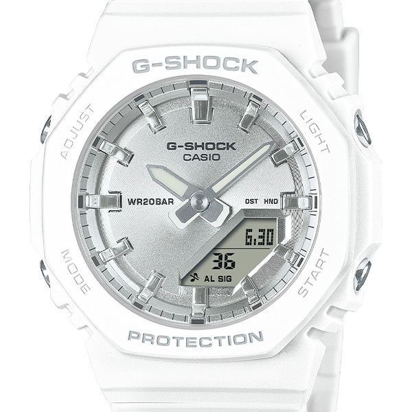 ベースモデルは人気のデジタル・アナログコンビモデルを小 型 化したGMA-S120、GMA-S140、GMA-P2100の3モデル。白のワントーンでまとめながらも、文字板やインデックスパーツにシルバーの蒸着加工を施し、煌びやかで華やかな印象に仕上げました。シルバーのメタル加工が施されているため、シルバーアクセサリーとも好相性。またバンドには環境に配慮したバイオマスプラスチックを使用しています。夏の爽やかなビーチリゾートファッションのコーディネートにもぴったりなシリーズです。