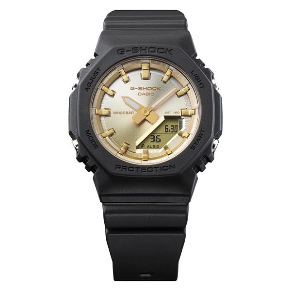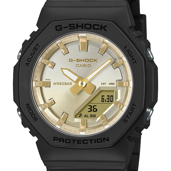 ベースモデルは、人気のデジタル・アナログコンビモデルGMA-S2100を更に小型化したGMA-P2100。バンドの長さも短くすることで、手首の細い方にもフィットするよう装着性を高めました。美錠とサイドボタンもステンレス素材を使用し、質感を高めています。シンプルでミニマルな印象になるように仕上げました。ベゼル、バンドの主な樹脂パーツにバイオマスプラスチックを採用。原料に再生可能な有機資源を使うことで、環境負荷低減への貢献が期待されています。リゾートスタイルのアクセントとして、手元に華やかさをプラスします。
