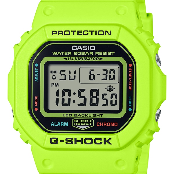 1983年の発売以来、飽くなき強さを求めて進化を続けるタフネスウオッチG-SHOCKから、トップアスリートチーム「TEAM G-SHOCK」、そしてすべてのアスリートをサポートするENERGY PACKです。デザインモチーフはエナジー。ビビッドなブルー、レッド、イエローで、定番の5600ケースを鮮やかに彩りました。LEDバックライト発光時には、電光石火をイメージした稲妻が浮かび上がります。またバンドには環境に配慮したバイオマスプラスチックを使用しています。強さと俊敏さをイメージさせるトップアスリートに相応しいカラーリングで、すべてのアスリートを応援します。