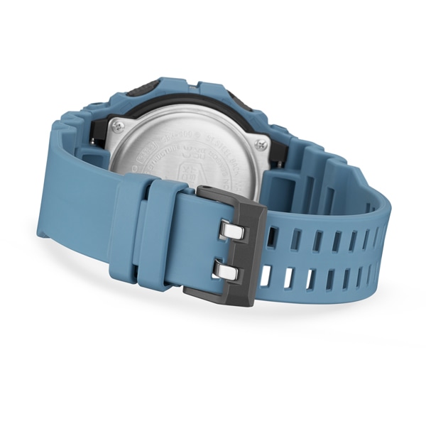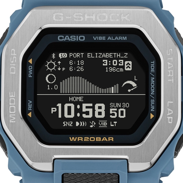 ベゼルは樹脂とメタルを組み合わせて構成。ベゼルのトップ部分はステンレスパーツを用い、ヘアラインとホーニング加工を施した仕上げ分けで強度と質感を両立したデザインになっています。また姿勢が安定しない環境を想定し、上下左右からの衝撃に耐えられる樹脂のガード構造を用い、6時位置のボタンガードと共にG-SHOCKならではの耐衝撃性能を備えました。バンドには、6時位置の根元部分にフィット性と水、汗逃げを考慮したスリットが入ったバイオマスプラスチックのソフトウレタンを採用し、着け心地を追求しました。遠くまで広がる自然な海をイメージしたブルー、砂浜をイメージしたベージュの2色展開でナチュラルな仕上がりのG-LIDEです。