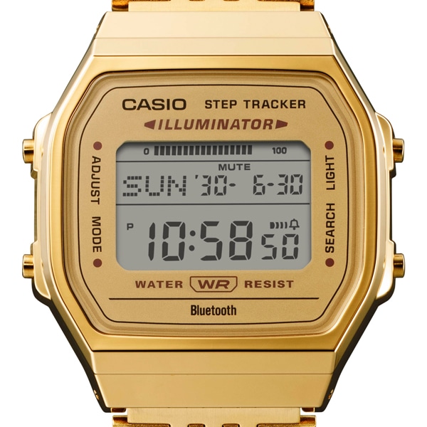 角型フォルムのクラシックデザインに、スマートフォンリンクや日常の健康管理に役立つステップトラッカー機能を備えたモデルです。デジタル液晶のシンプルなケースに、細やかな輝きを放つ多列タイプのメタルバンドを採用し、腕馴染みのよいフラットなフォルムに仕上げました。
