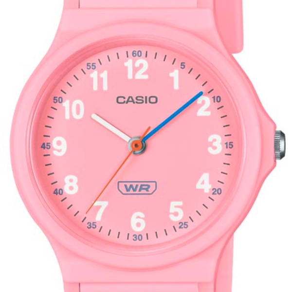 小ぶりなサイズの3針アナログウオッチです。シンプルで見やすいアラビアインデックスを採用。また、時針とインデックス、分針とインデックス外側の目盛りの表記の配色を対にし、時間が読みやすくファーストウオッチにぴったりのモデルです。カラーは定番のブラックとホワイト、ライトブルーとピンクのパステルカラーをラインアップしました。