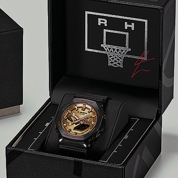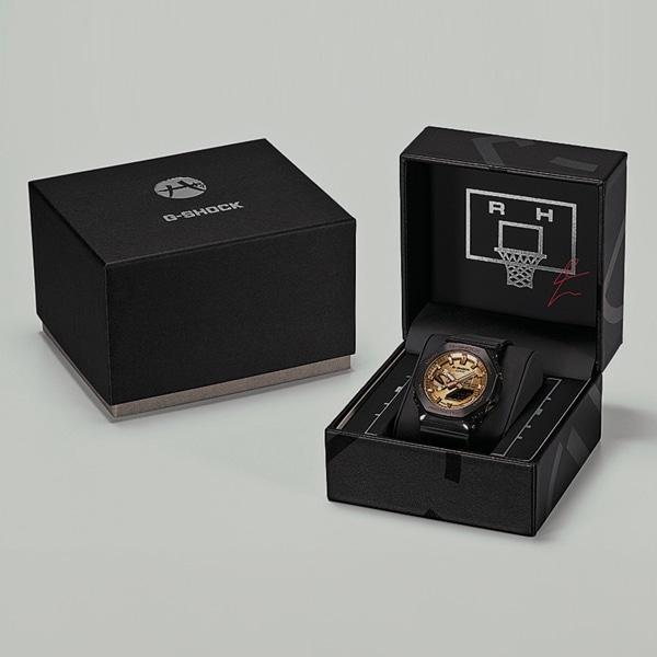 メインカラーをゴールドにし、G-SHOCKのブランドカラーと彼の情熱をあらわすレッドの差し色を加えて、文字板にはバスケットコートをイメージしたパターンをデザインしました。バンドには時計のフェイスを引き立てるブラックを採用し、引き締まった印象を与えています。遊環には、背番号「8(八)」にちなんで作られた八村選手オリジナルロゴを刻印。裏蓋には八村選手のサインを施しました。
