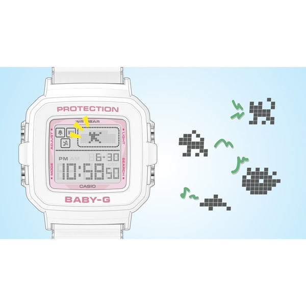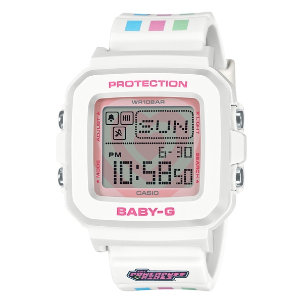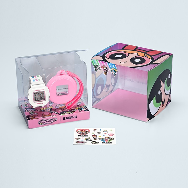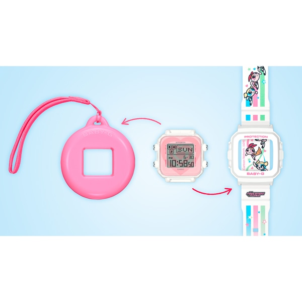 今年で30周年を迎えるBABY-Gと25周年を迎えたタフでキュートな「パワーパフ ガールズ 」とのスペシャルコラボレーションモデルです。ベースモデルには、BABY-G+PLUSシリーズのBGD-10Kを採用。スクエアベゼルのデジタルウオッチとストラップ付専用ホルダーがセットになったモデルで、手首に着けるだけでなく専用ホルダーにセンターケースをセットすれば、ユニークなチャームとしても活躍します。
