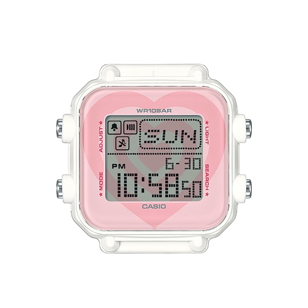 バンドには「パワーパフ ガールズ 」のオフィシャルロゴをあしらい、主人公のブロッサム、バブルス、バターカップを、それぞれのイメージカラーとともにプリント。引通しタイプのバンドを取り外すと、元気いっぱいのガールズが現れる遊び心を取り入れました。裏蓋にもキャラクター刻印を施しています。また、液晶にはパワーパフ ガールズのシンボルであるハートマークをレイアウト。キュートなピンクカラーでフェイスを彩ります。