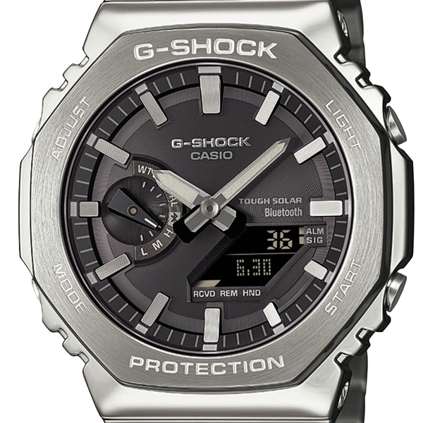 G-SHOCK初代モデル“DW-5000C”のコンセプトを受け継いで開発されたアナログ「2100」シリーズのフルメタルモデルです。スクリューバックケース、ベゼル、バンドにステンレススチールを採用し、落下時の衝撃からモジュールを守る耐衝撃構造をとりながらも、無駄を省いたシンプルなデザインを目指しました。1983年に誕生したDW-5000Cにも採用された八角形のベゼル形状や、バンドのディンプルデザインも継承しています。