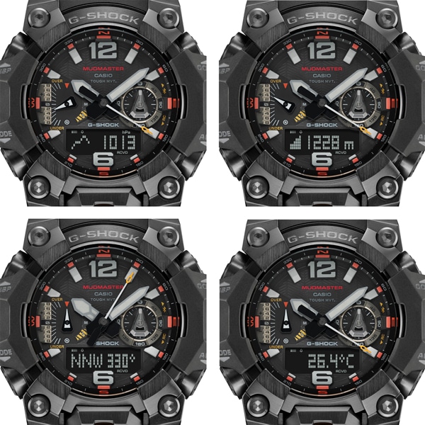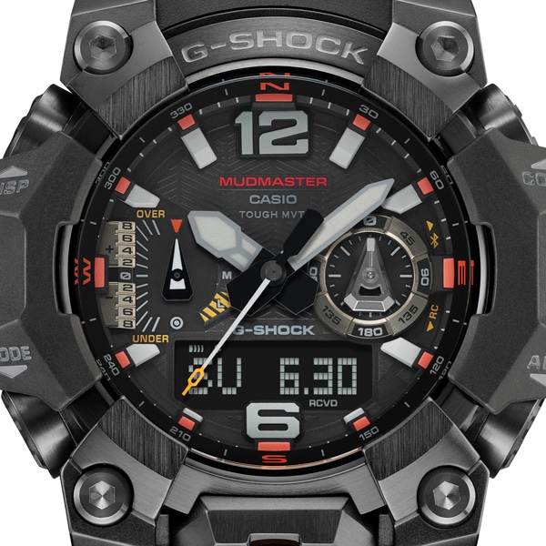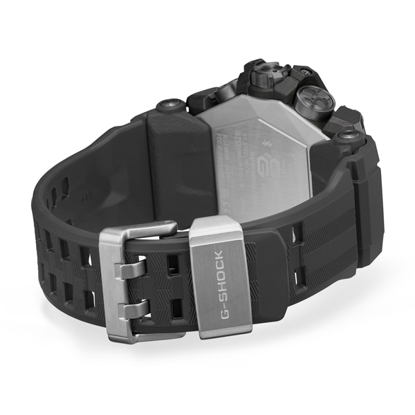 MUDMASTER GWG-B1000ECは、耐衝撃、防塵・防泥、耐振動構造に、Bluetooth搭載電波ソーラーやトリプルセンサー等を装備。カーボンファイバー強化樹脂や鍛造メタルなどの異素材融合で、耐久性と装着性を両立する力強いデザインに仕上げました。目標地点への方角を指針するロケーションインジケーター機能も搭載しています。
